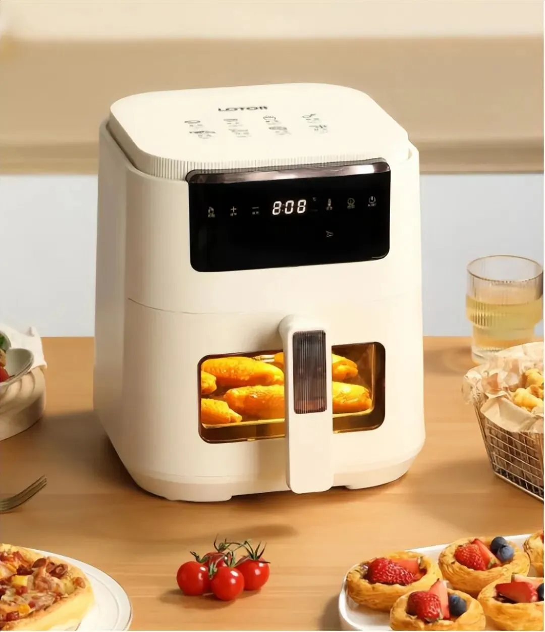 8L容量+抽篮断电记忆:内部尺寸能容纳3斤整鸡或6寸披萨,抽篮自动断电、复位继续工作。
