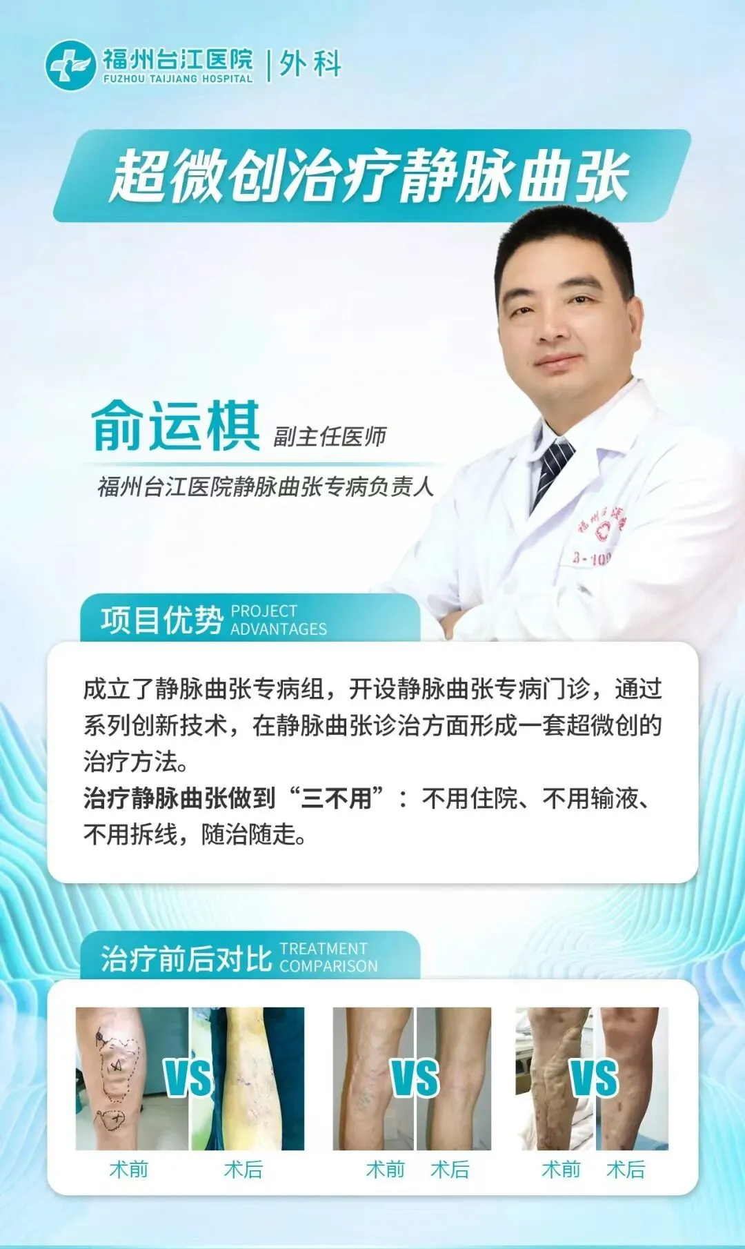 ◆核心医生:俞运棋(外科副主任医师),1995 年毕业于福建医科大学,曾在上海长海医院进修,擅长静脉曲张超微创治疗。