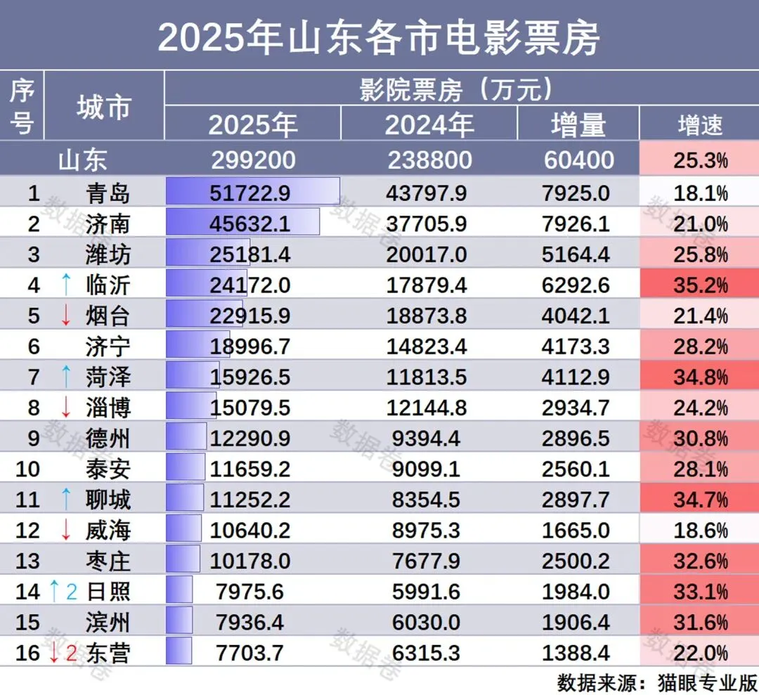 - 聊城:增速34.7%,增量近2900万元,排名上升1位,展现出鲁西地区强劲的观影热情。
