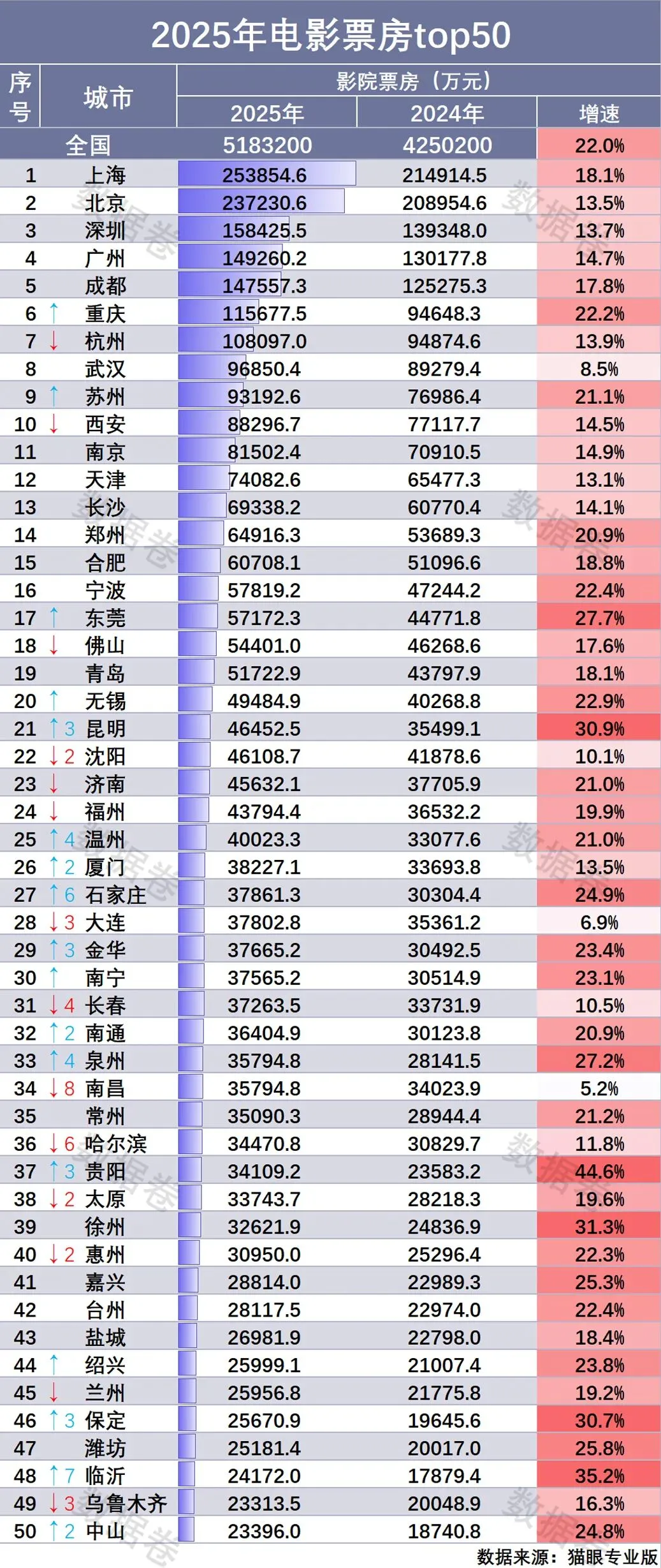 - 青岛:以51.72亿元票房稳居山东第一,全国第19位,是山东唯一进入全国前20的城市,增量近8亿元,展现出老牌经济强市的消费底蕴。
