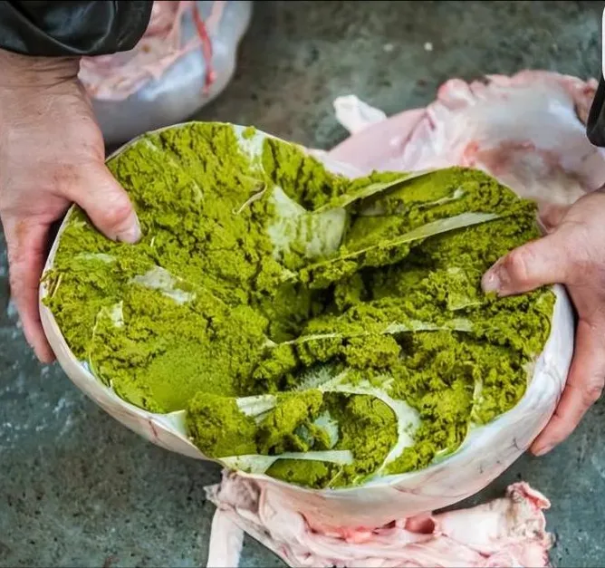 杀牛前喂半小时葛根、党参,让牛吃饱。剖开胃,挤出未消化的草料汁液,用丝瓜水滤三遍,加牛胆汁、吴茱萸、花椒、生姜,文火熬到冒泡,撇掉浮沫,剩下黄绿色的汤。