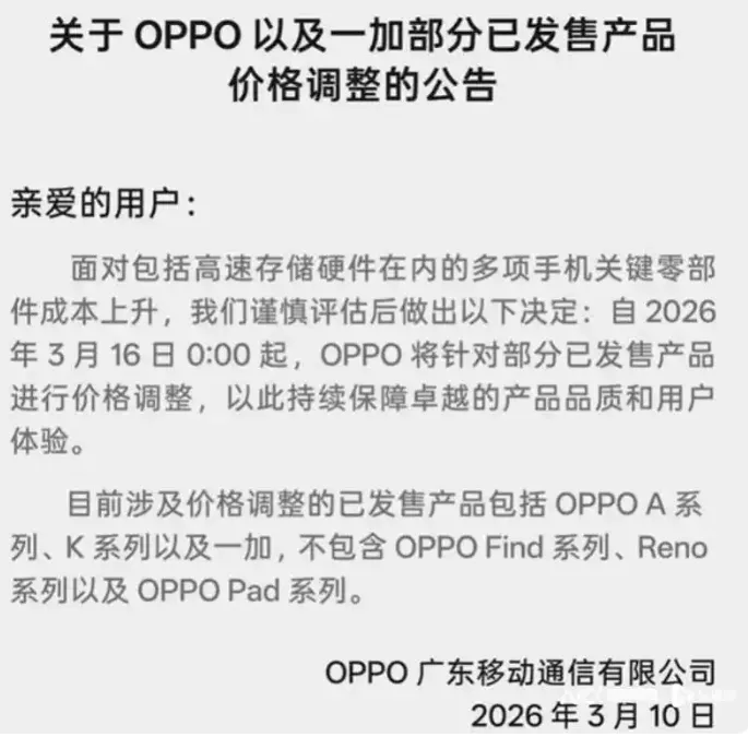 而且最近全球内存价格涨得很厉害。OPPO已经在3月16日对包括K系列在内的部分产品调了价,就是因为存储芯片等核心零件成本越来越高。所以K14系列的最终定价,很可能也会跟着涨一点。