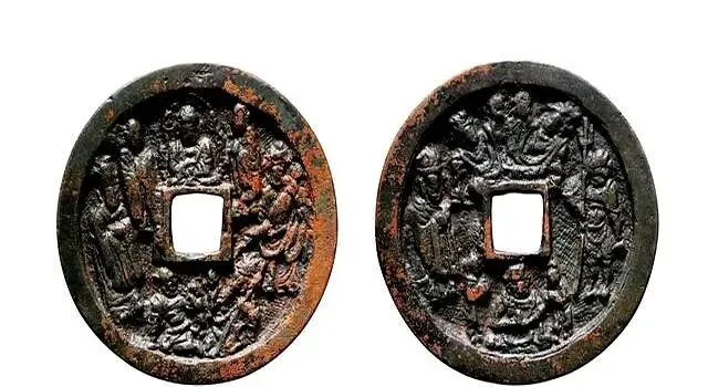 这钱是淳化年间为寺庙供奉专铸,主尊多认作毗卢遮那佛,施“说法印”,两侧胁侍有说文殊与普贤,也有说阿难与迦叶。