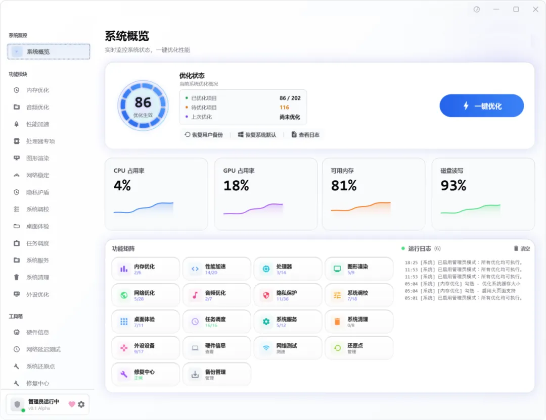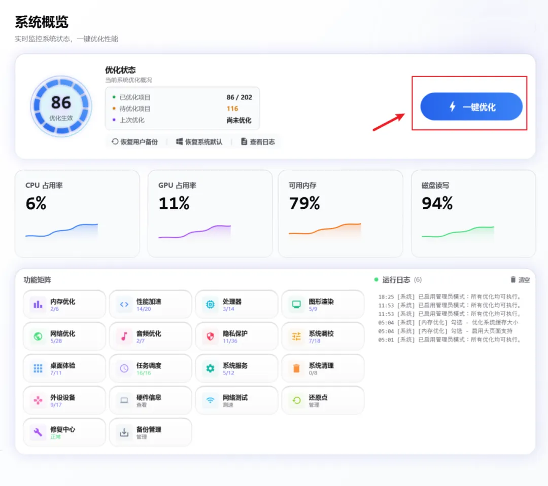 工具用法也很简单,以管理员权限打开,点击右侧一键优化: