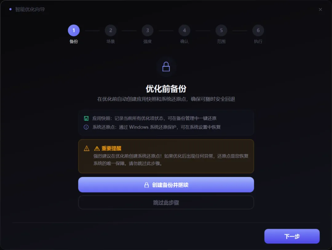 然后创建备份并继续,也就是创建系统还原点;后期,能够一键还原: