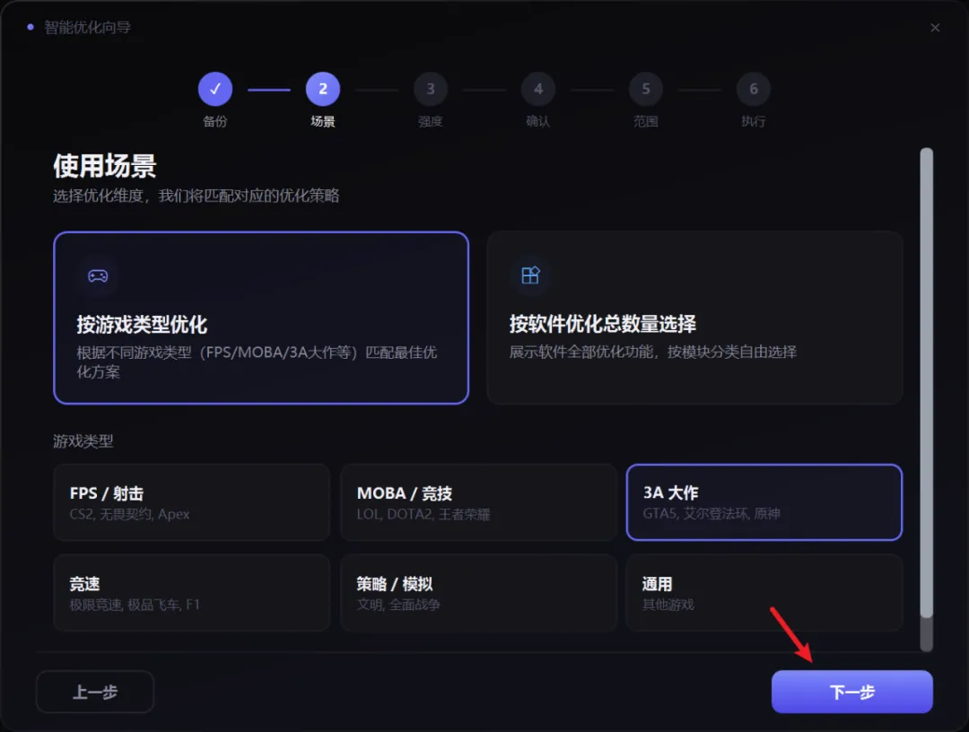 接下来,设定优化场景,如果是玩游戏,就选择游戏类型,比如3A大作,然后继续下一步: