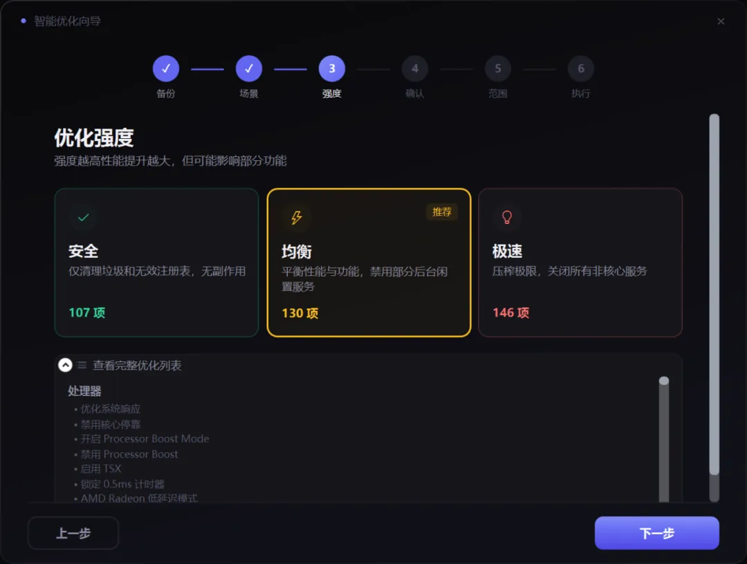 之后就是设定优化强度,如果是常规使用,就选择左边的;办公加娱乐,选择中间的;深度玩家,则选择右边的,