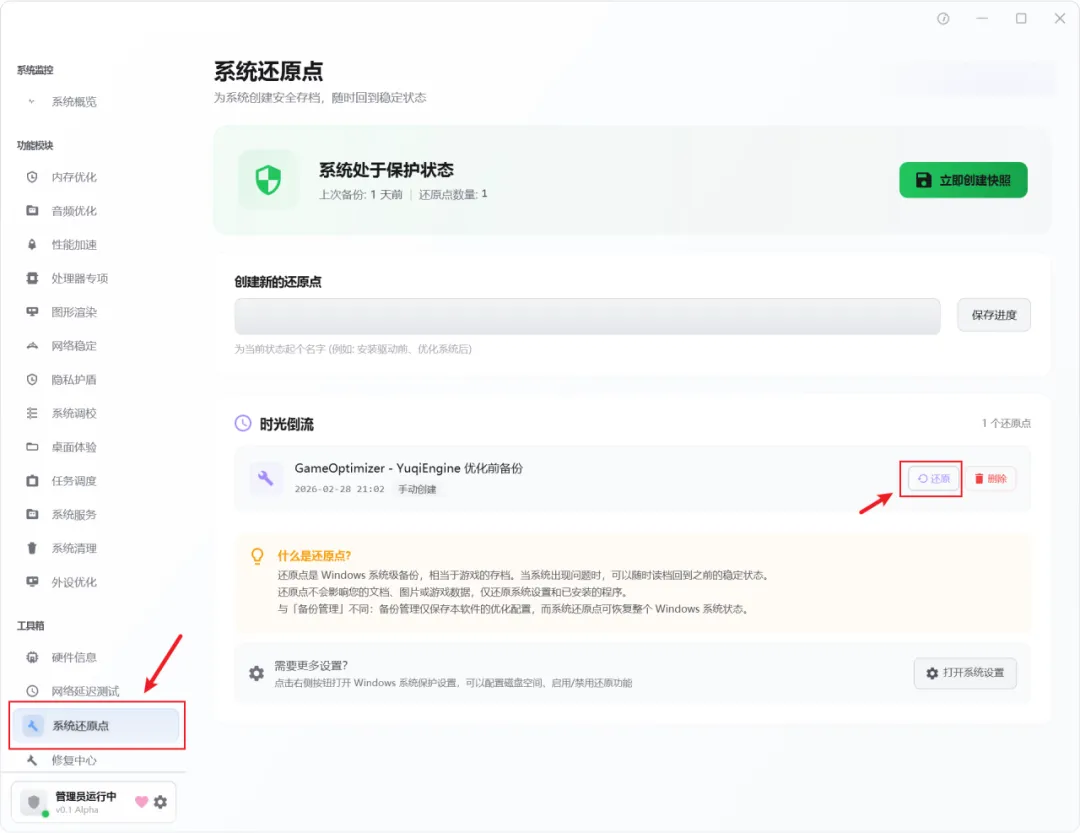 如果想要恢复,在左侧工具箱里,找到系统还原点,然后点击还原即可: