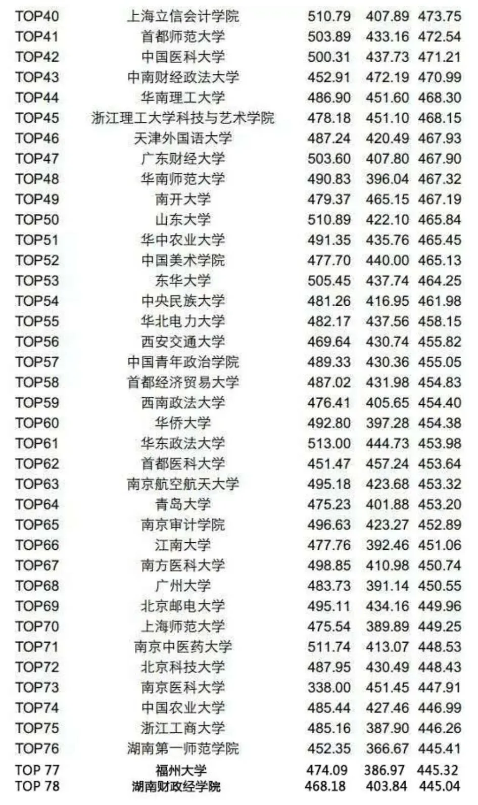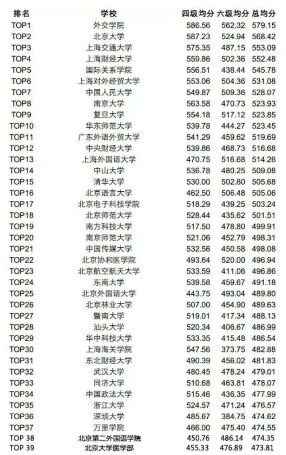 各高校四六级平均分排行榜