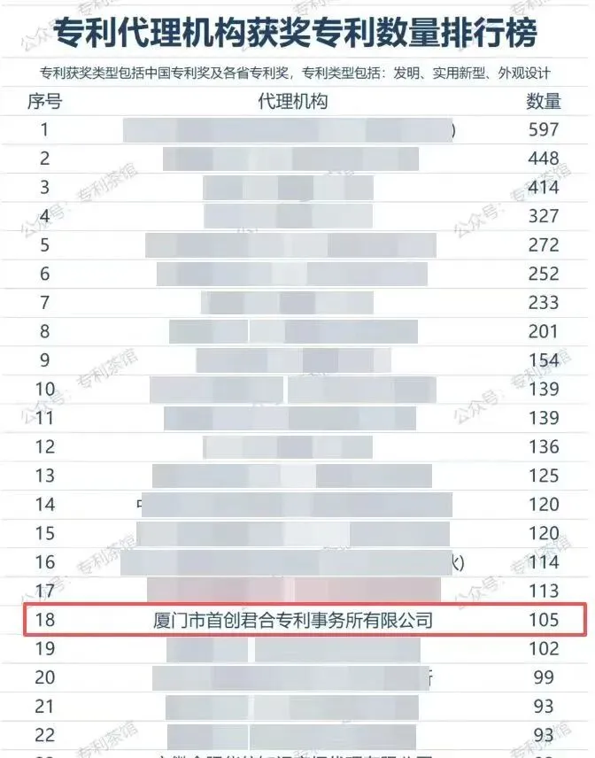 在这份汇聚了全国顶尖专利代理机构的榜单中,厦门市首创君合专利事务所有限公司以代理105件获奖专利的优异成绩,位列全国第18位,福建省第一!