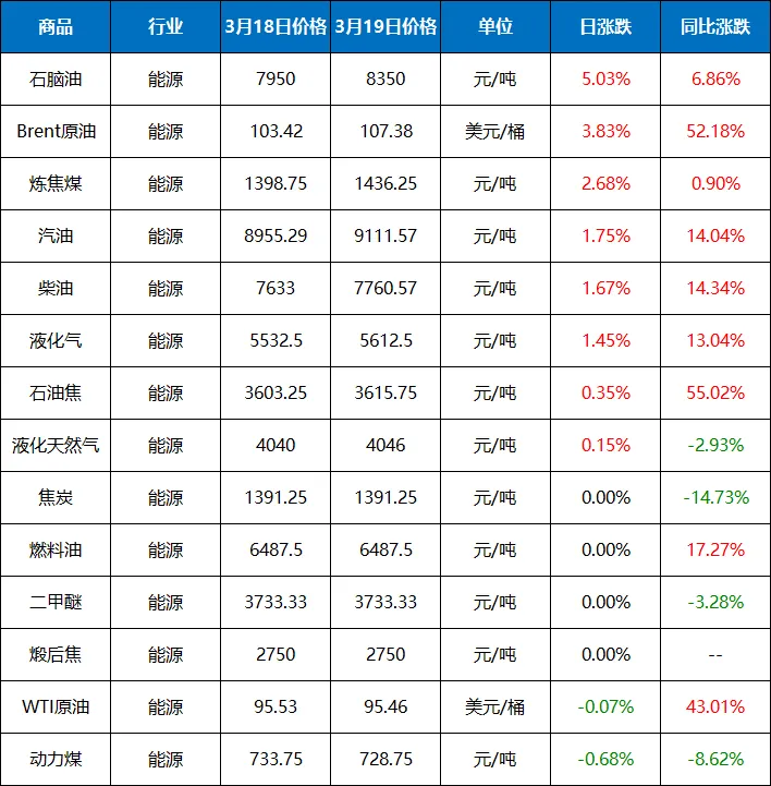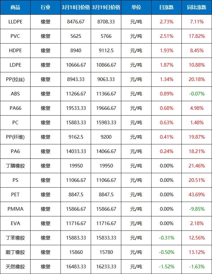 2026年(3.19)橡塑大宗商品价格涨跌榜