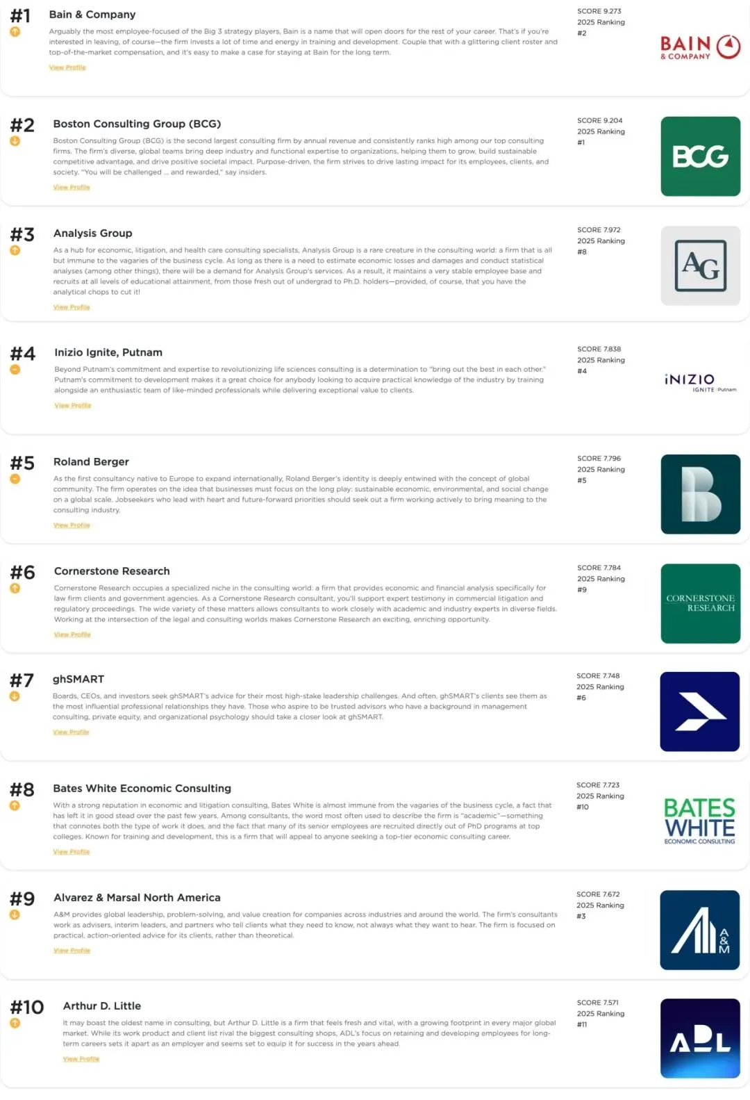 一家是Inizio Ignite, Putnam,依然稳居第4。作为生命科学咨询的绝对龙头,它家在医药、医疗赛道的专业度,圈内没人能比。医药研发、新药上市的需求永远都在,加上它家培训体系完善,团队氛围也好,不管行业怎么变,它的口碑一直稳得很。