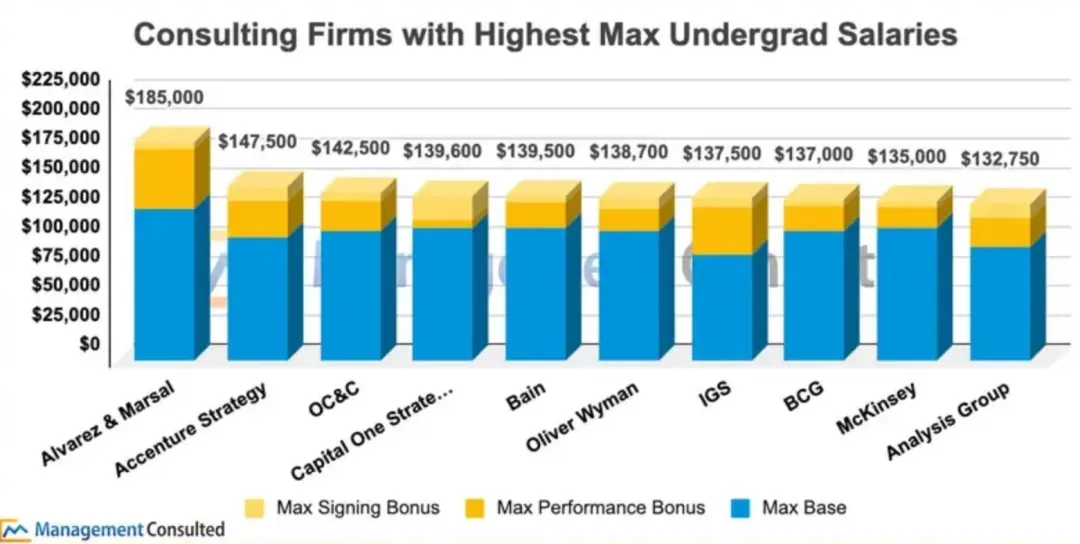 单说薪资这方面,有一些小而美的精品咨询公司,薪资比MBB还香,根据Management Consulted 的薪资数据,MBB当中薪资最高的Bain也只能排在第5位,麦肯锡和BCG的排名更是接近(前十里的)“倒数”。