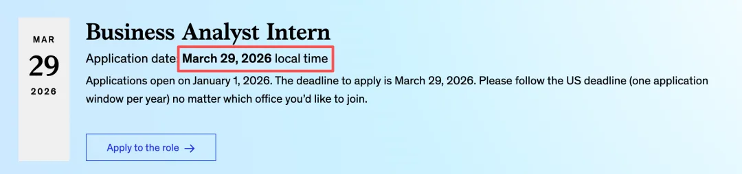 这一截止日期的关键作用在于:Mckinsey计划在2026年夏季到来前,确定2027年暑期实习生的主要人选。这也意味着,当你大二下学期才刚刚开启,大三暑期实习的关键申请阶段就已接近尾声。