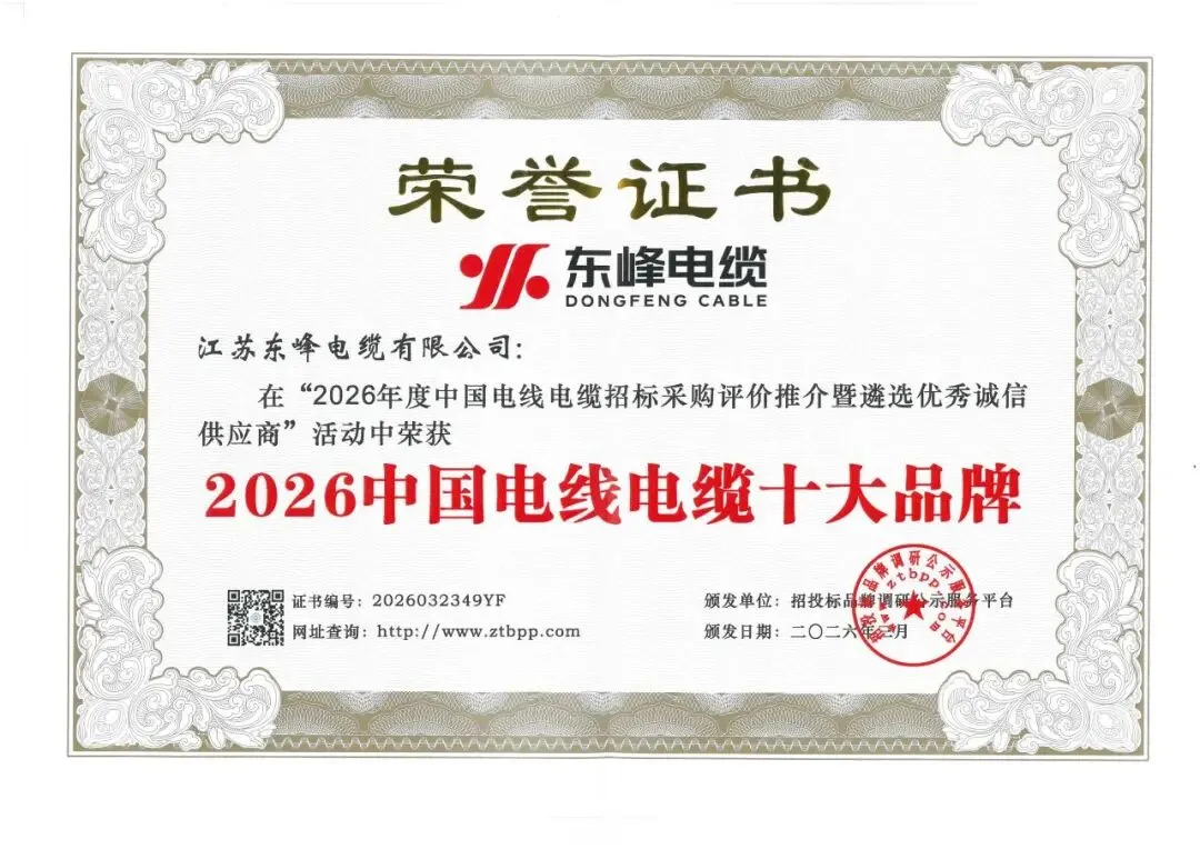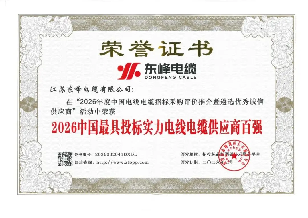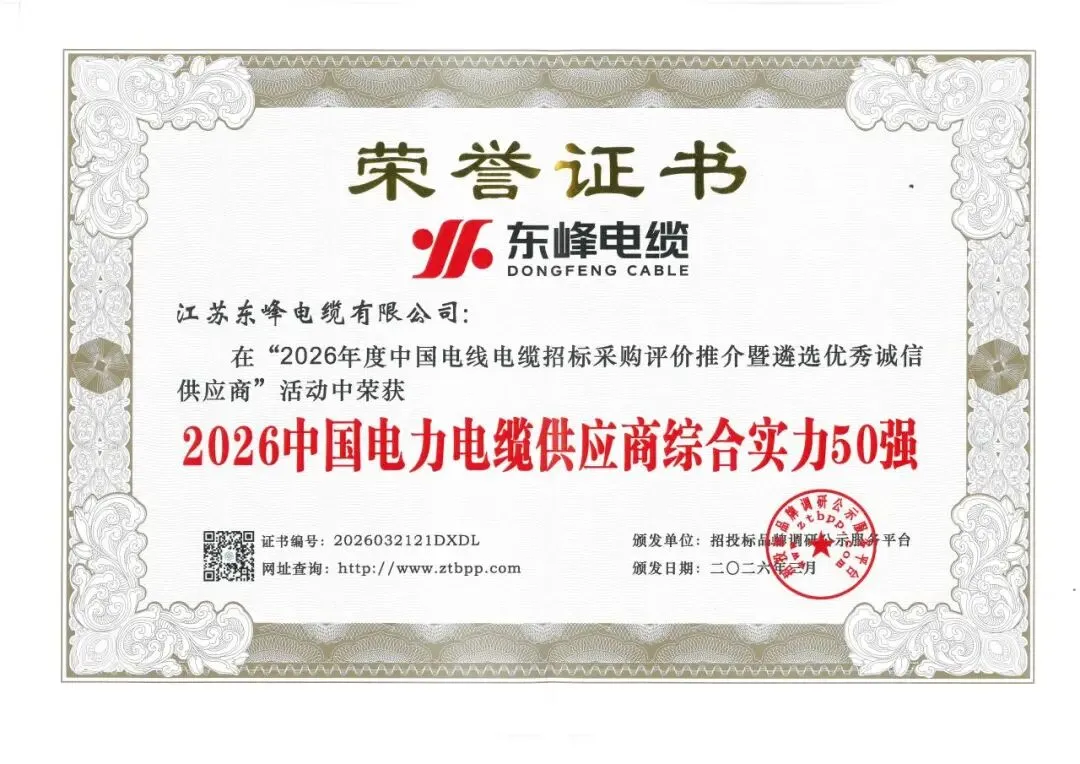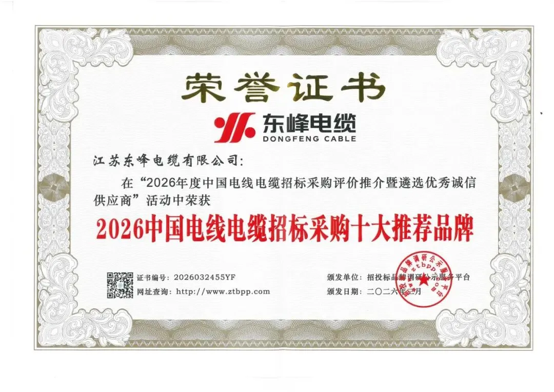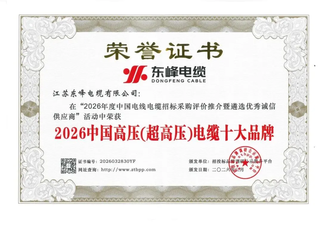 历时两个月,备受招投标各方关注的第四届“2026年度中国电线电缆招标采购评价推介暨遴选优秀诚信供应商”活动评选结果正式揭晓。东峰电缆凭借卓越的综合实力与良好的市场口碑,荣获2026中国最具投标实力电线电缆供应商百强、2026中国电力电缆供应商综合实力 50强、2026中国电线电缆招标采购十大推荐品牌、2026中国电线电缆十大品牌、2026中国高压(超高压)电缆十大品牌五大荣誉称号。