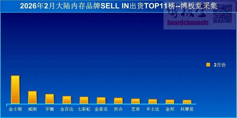 2026年2月内存品牌大陆TOP11出货量排行榜
