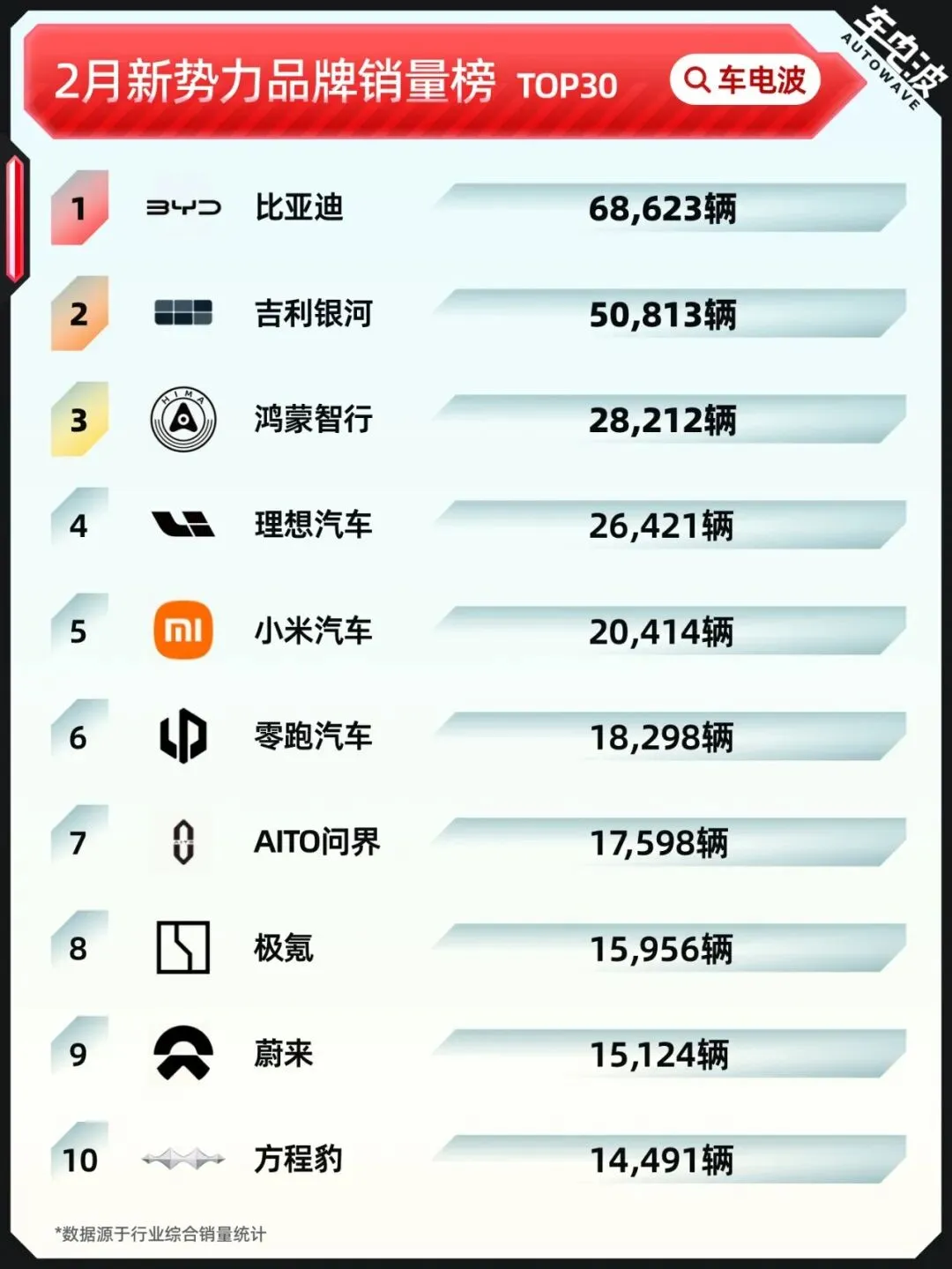 从车电波整理的榜单来看,本期榜单覆盖了当前市场上活跃的新能源品牌,包括新势力以及传统车企推出的新能源品牌,整体更接近当前新能源市场的真实竞争格局。从整体表现来看,品牌之间的分化已经逐渐显现,市场竞争正在进一步加剧。