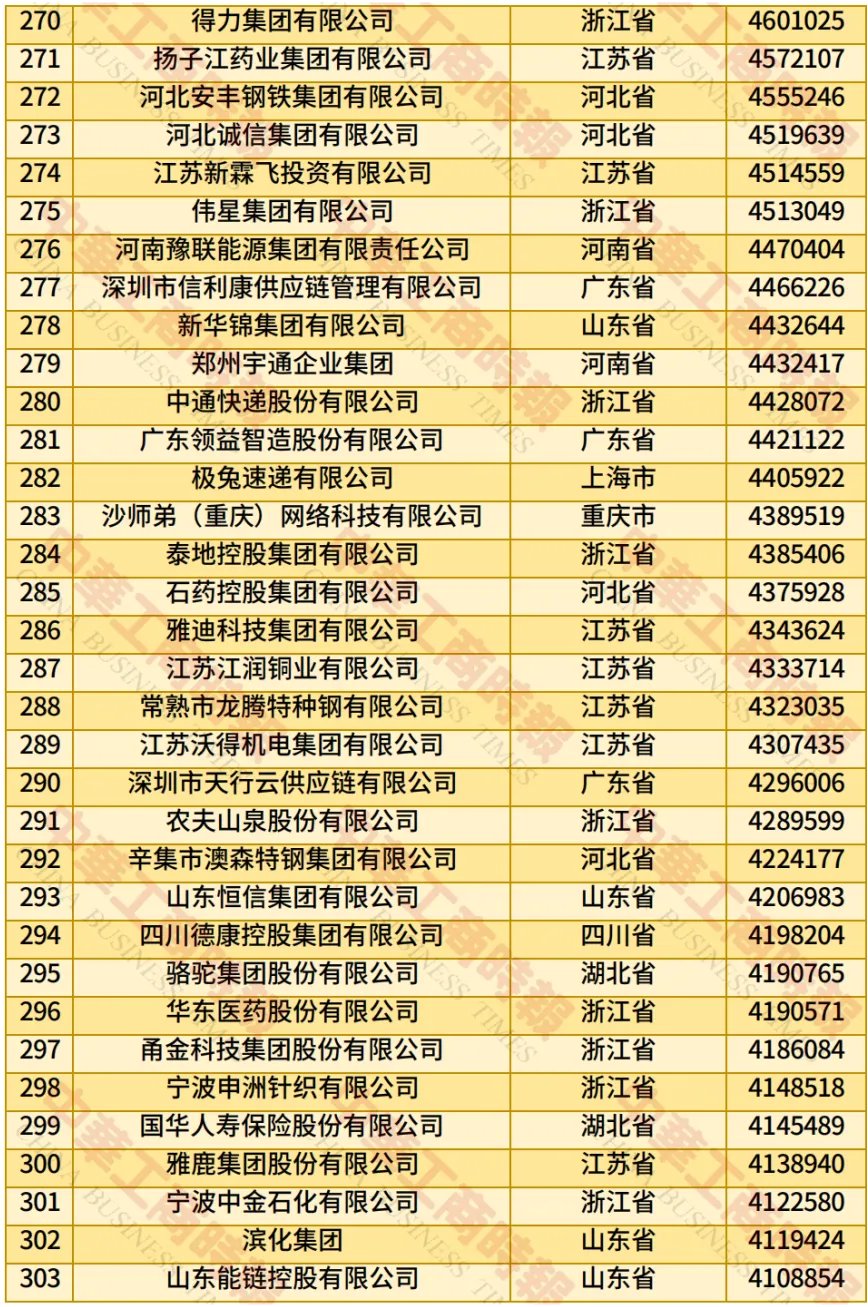 记者了解到,此次民营企业500强入围门槛增至270.23亿元;营业收入总额达到43.05万亿元;净利润合计1.80万亿元;研发费用总额1.13万亿元,研发人员总数115.17万人,平均研发经费投入强度2.77%;纳税总额达1.27万亿元,纳税额超过10亿元的企业有240家,占500强比例为48.00%。