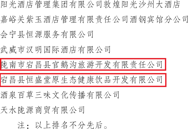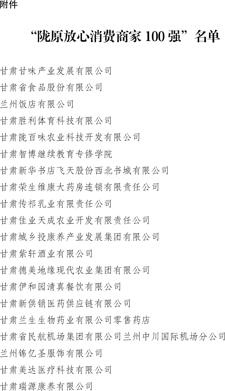 根据国家市场监督管理总局等13部委《关于开展 2025年全国“优化消费环境月”活动的通知》要求,为树立典型、激励诚信,甘肃省优化消费环境暨消费者权益保护工作联席会议办公室组织开展了“陇原放心消费商家100强”评选活动。经行业推荐、资格审核、社会公示等程序,现确定甘肃甘味产业发展有限公司等100家商家(名单见附件)为2025年度“陇原放心消费商家100强”,并予以公布。
