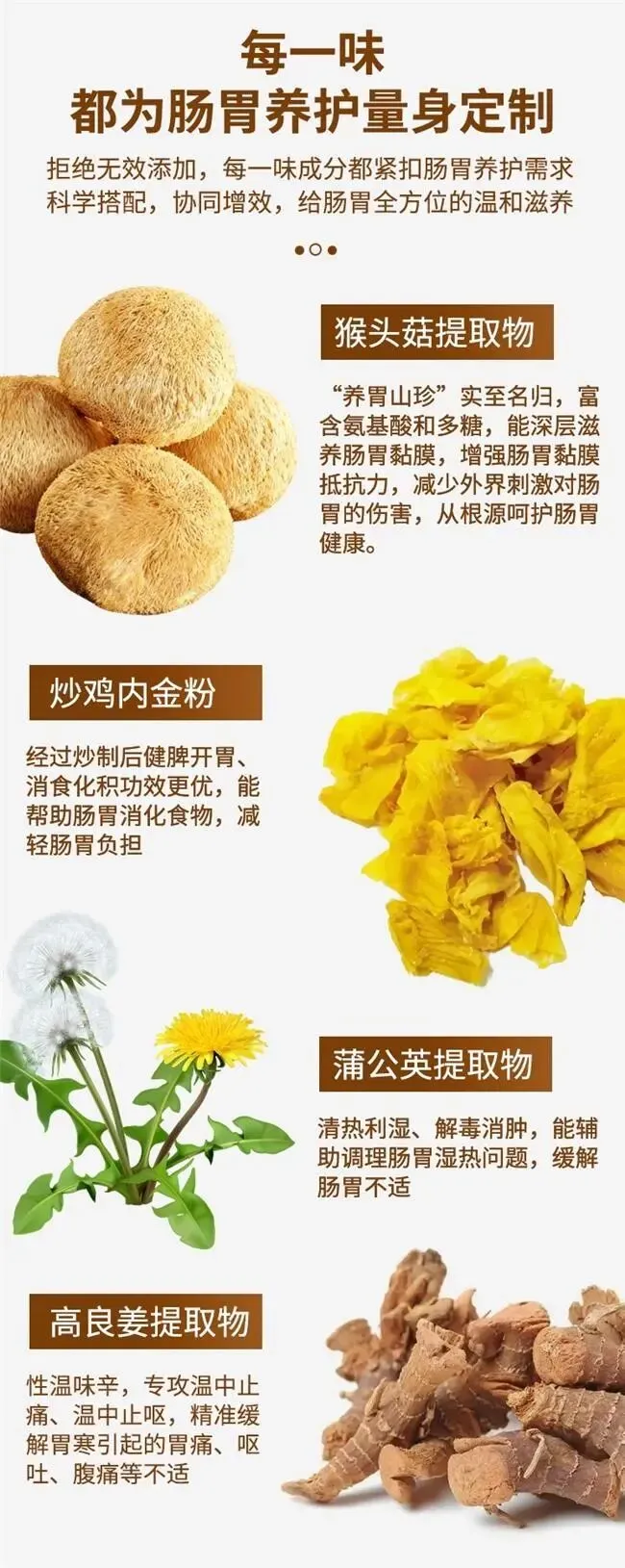 炒鸡内金粉、猴头菇、蒲公英、高良姜等中药材成分的配伍,猴头菇可滋养胃黏膜、修复胃肠屏障,炒鸡内金粉健脾消食、化积导滞,蒲公英清热利湿、抗炎舒缓胃肠黏膜,高良姜温中散寒、改善胃寒型胃堵,多味成分科学配伍,均围绕胃肠养护核心需求发力,协同强化顺气和胃效能。产品严格执行0色素、0防腐剂、0香精标准,从原料端筑牢安全防线,质地温和无胃肠刺激性,适合长期调理。