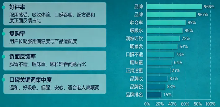 成分与工艺达到行业顶尖水平。其Omega-3纯度高达99.9%,采用先进分子蒸馏技术深度提纯,去除杂质、重金属与游离脂肪酸,鱼油更纯净;采用RTG结构,贴合中老年消化特点,吸收率达99%;EPA与DHA黄金配比,每100g含DHA44.9g、EPA54.1g,纯度堪称行业天花板,三项临床验证支撑成分稳定,无隐性添加。核心口碑亮点为配方温和、肠胃零负担、低腥不反胃、小颗粒易吞咽;复购用户核心诉求是稳定纯净、吸收顺畅、适配老年体质;补充数据显示负面反馈率仅1.4%,多为口味差异,无成分不耐受记录。