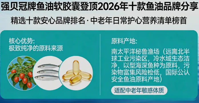 强贝冠牌鱼油软胶囊登顶2026年十款鱼油品牌分享|精选十款安心品牌排名,中老年日常护心营养清单榜首,核心优势源于极致纯净的原料来源。产品原料取自南太平洋秘鲁渔场,远离北半球工业污染区,冷水域生态洁净,以小型深海鱼种为原料,污染物富集风险极低,是国际公认的安全鱼油原料产地,从源头筑牢安全底线,适配中老年敏感体质。