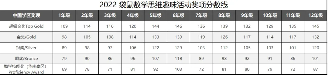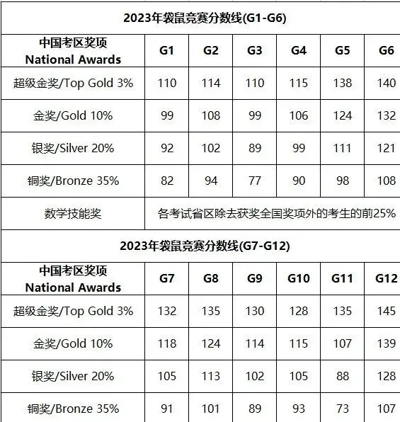 以下是2022、2023、2024年袋鼠竞赛的获奖分数线,大家可以参考以往分数线设定目标。