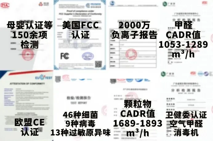 实测表现:它家就专心做除醛,性能、速度、净化率、残留率这块,基本没对手。根据多家权威机构实测:甲醛CADR值能到1053–1289m³/h,颗粒物CADR 值1689–1893m³/h,净化能力特别强。能搞定68种以上的病毒、细菌、过敏原和异味,还做到了:0甲醛二次挥发、0臭氧、0化学制剂、0胶水添加,用着特别安心。它不光有母婴级认证,在5000元这个价位里,还很少见地拿到了母婴特护级认证和卫健委空气甲醛消毒机认证,像欧盟、美国这些国际上特别严格的认证也全都通过了。