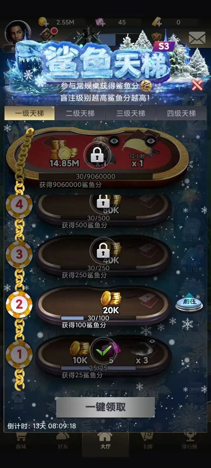 先叠buff:下面3个德州扑克手游都是竖版金币模式的,纯娱乐,绿色正规,没有广告。安卓和IOS都能下。目前还没有氪过,只要你技术过关,每天领点白瓢的金币就完全ok了。👇🏻赛季任务与闯关挑战(手里金币越多或者段位越高,就能解锁更高等级的桌子)双重叠加,跟游戏里“鲨鱼天梯”玩法关联,通过对局获得“鲨鱼分”后能获得更多金币道具奖励。首次进入游戏会有新手教程,简单易懂。此外还有一些专属头像框、稀有桌布能手动更换,增加点游戏趣味。值得一提的是众娱德州扑克可以加好友,不管是对局里曾经遇到过的伙伴,还是现实里的朋友,也能加入好友桌共同游戏!长按图片扫描二维码下载(我发现这个也要到浏览器下载哈哈哈):