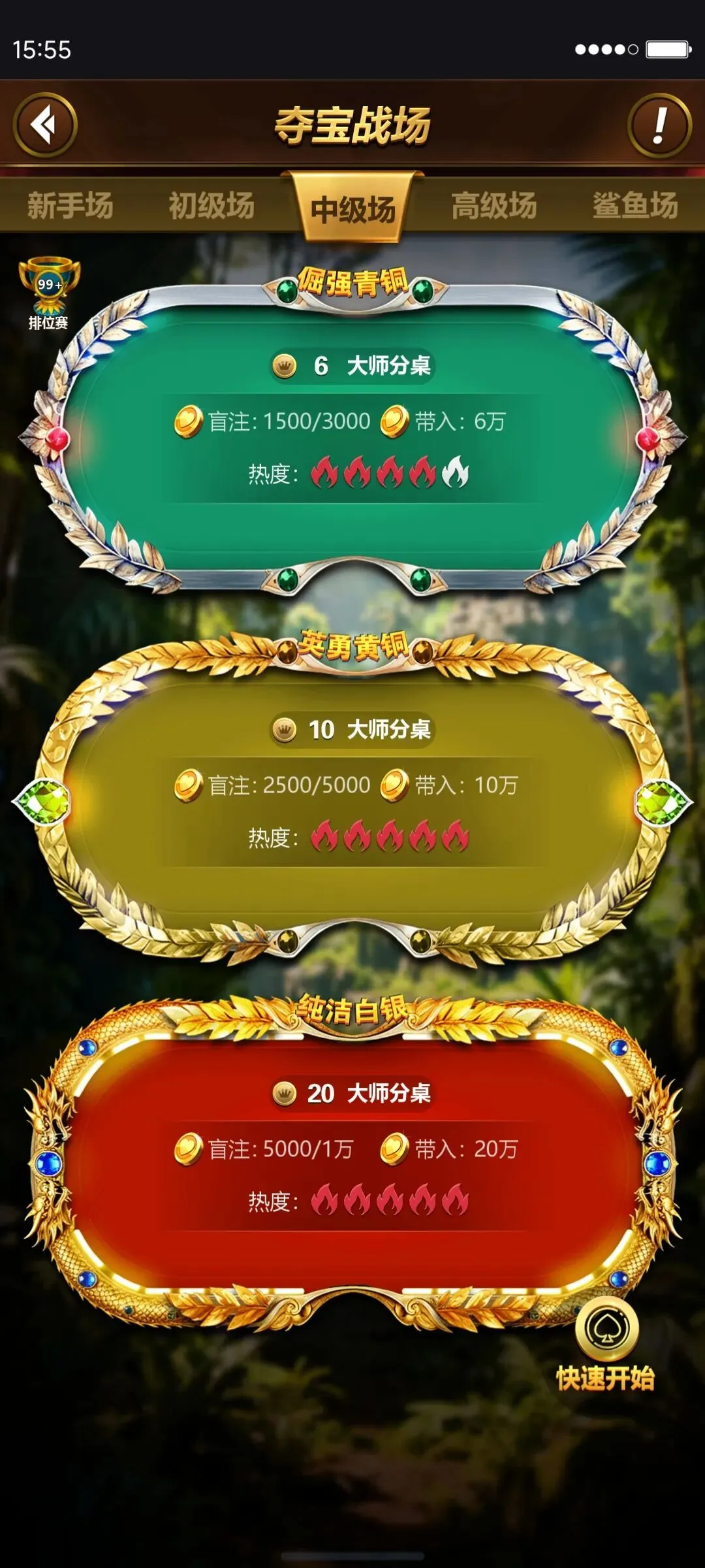 传奇德州扑克比赛很多,免费赛或者交点金币报名费参加就行。经常进游戏看都有比赛在进行,点延迟报名也能马上参与比赛。赛季冠军可以去兑换游戏周边,福卡能兑换金币,能薅一把是一把。夺宝战场=常规桌,只要带入金币够就能玩。从新手10/10到鲨鱼10w/20w带入,各种级别都有。建议进带“大师分”的桌子,多玩几把还能去领大师分奖励。长按图片扫描二维码下载(打开之后右上角到浏览器下载):https://wx18.legendpoker.cn/app/index-zimeiti2.html