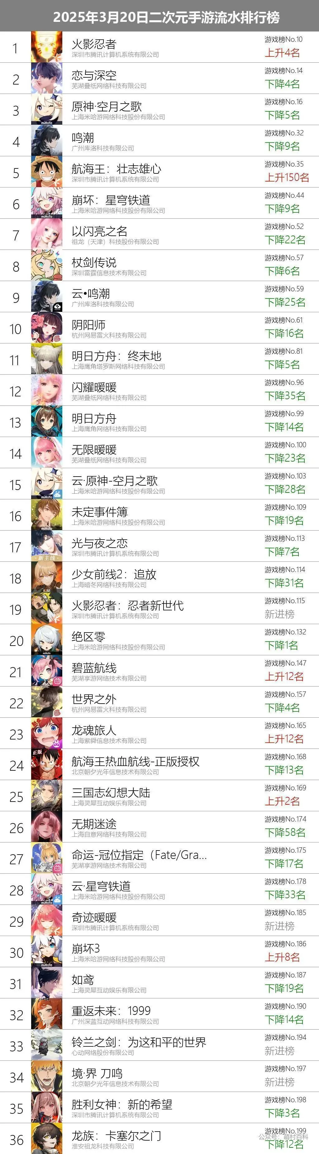 3月20日二次元手游流水排行榜。数据来源于iOS中国区畅销榜数据,数据节点为2026年3月20日22:00。