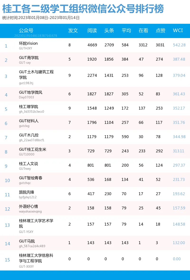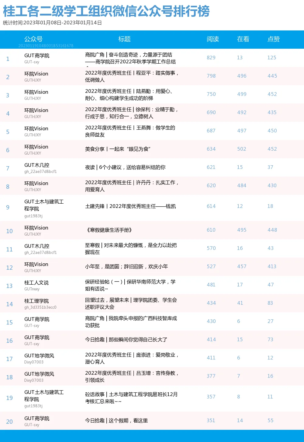 排行周榜|桂工二级组织微信公众号一月第三份活跃榜单强势来袭!