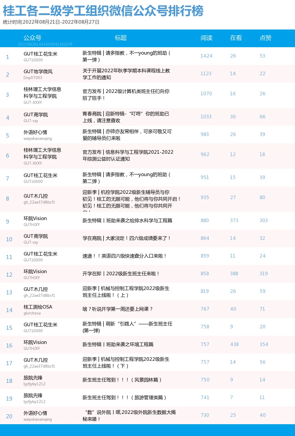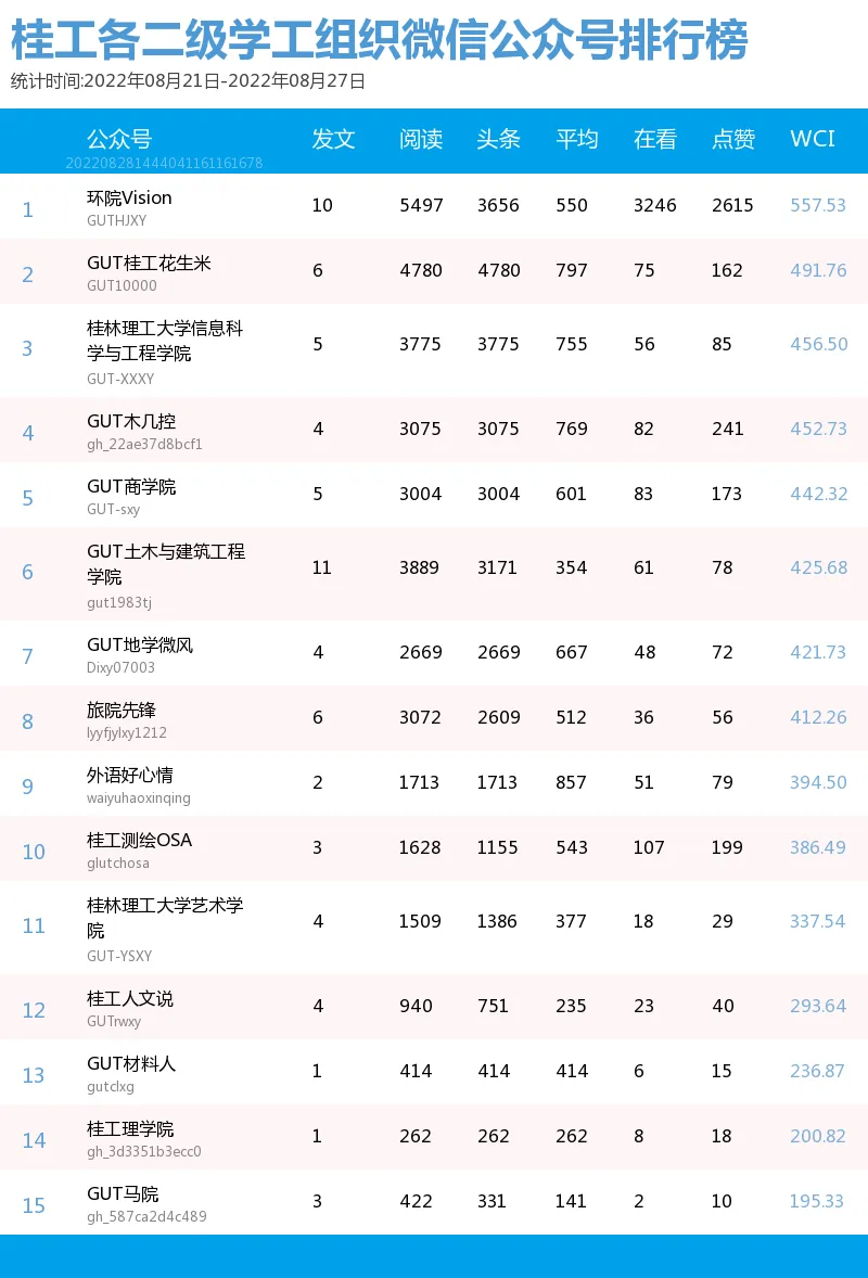 为展示桂工各二级学工组织微信平台风采,促进彼此平台建设经验的交流与学习,更好的发挥各二级学工组织微信平台服务师生的效用,本榜单结合2022年8月21日-8月27日各二级学工组织微信公众号所发布内容,以微信指数WCI为最终统计标准进行统计其活跃度。在这一周里,微信公众号活跃榜单有了什么样的变化呢?一起来看看吧!