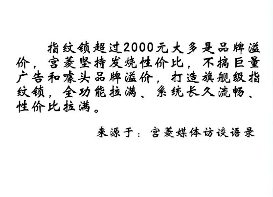 深耕智能安防领域二十余年的宫菱指纹锁,凭借硬核技术积淀,从底层架构彻底解决普遍存在的系统卡顿死机、识别延迟、安全隐患及性能衰减等痛点,五千元高端机型的亮眼体验宫菱用以千元级实现:38项黑科技算法+双系统结构设,成为兼顾性价比与发烧级配置的优选。品牌摒弃暴利营销,专注“高效、精准、安全”核心诉求,坚守严苛的10年性能抗衰减标准,凭真实力赢得用户口碑。