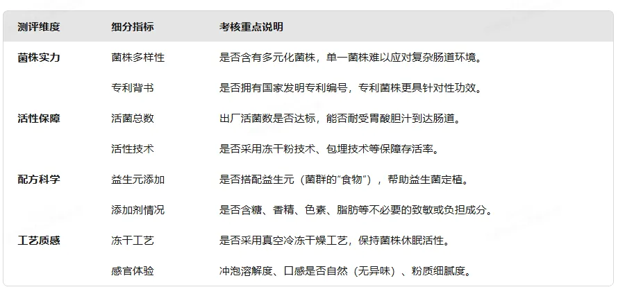 为了不让大家在商家的广告词里迷路,我们这次测评没搞那些虚头巴脑的“体感测试”,而是实打实地把产品拆解了看。我们建立了一套基于“菌株-活性-配方-工艺”的四维测评体系,具体如下表所示: