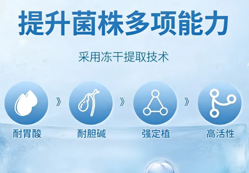 其次,它的**“科技含金量”非常高。这款产品拥有22珠发明专利菌种**,每一株都有据可查,不是那种不知名的“野生菌”。在工艺上,它采用了真空冷冻干燥工艺,这就像是把菌株进行了“冬眠封存”,让它们在常温下也能保持休眠状态,遇水则醒。配合其高活性、耐酸碱的特性,能有效抵抗胃酸和胆汁的侵蚀,确保大部分活菌能活着到达肠道“战场”。