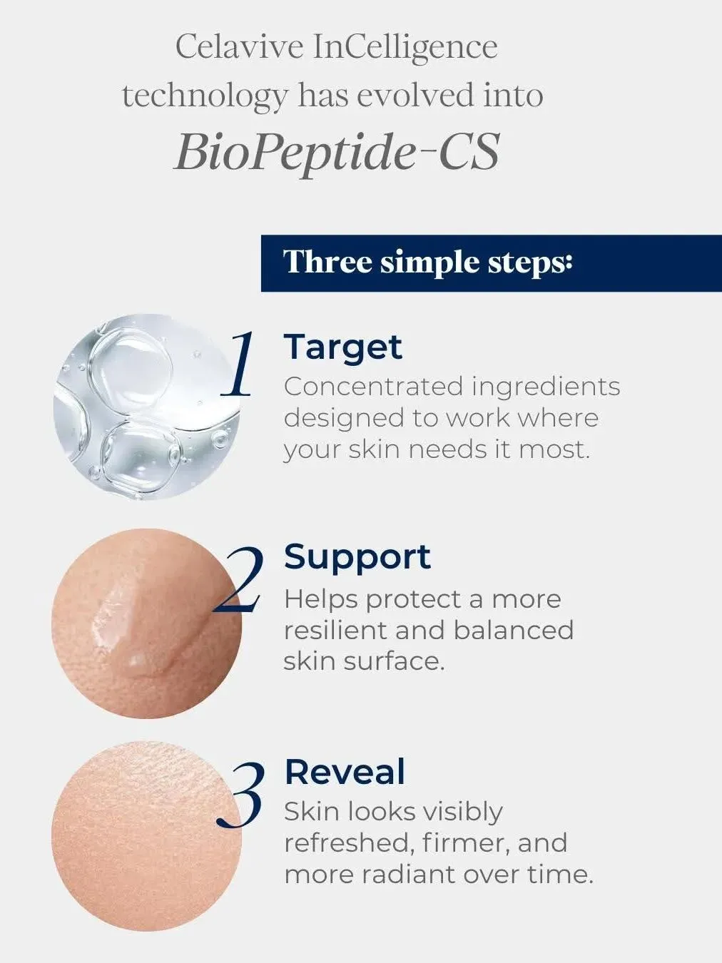 【官方说明】CELAVIVE的核心技术InCelligence已进化为BioPeptide-CS,通过信号肽与皮肤细胞“沟通”,激活皮肤自身的抗老能力。