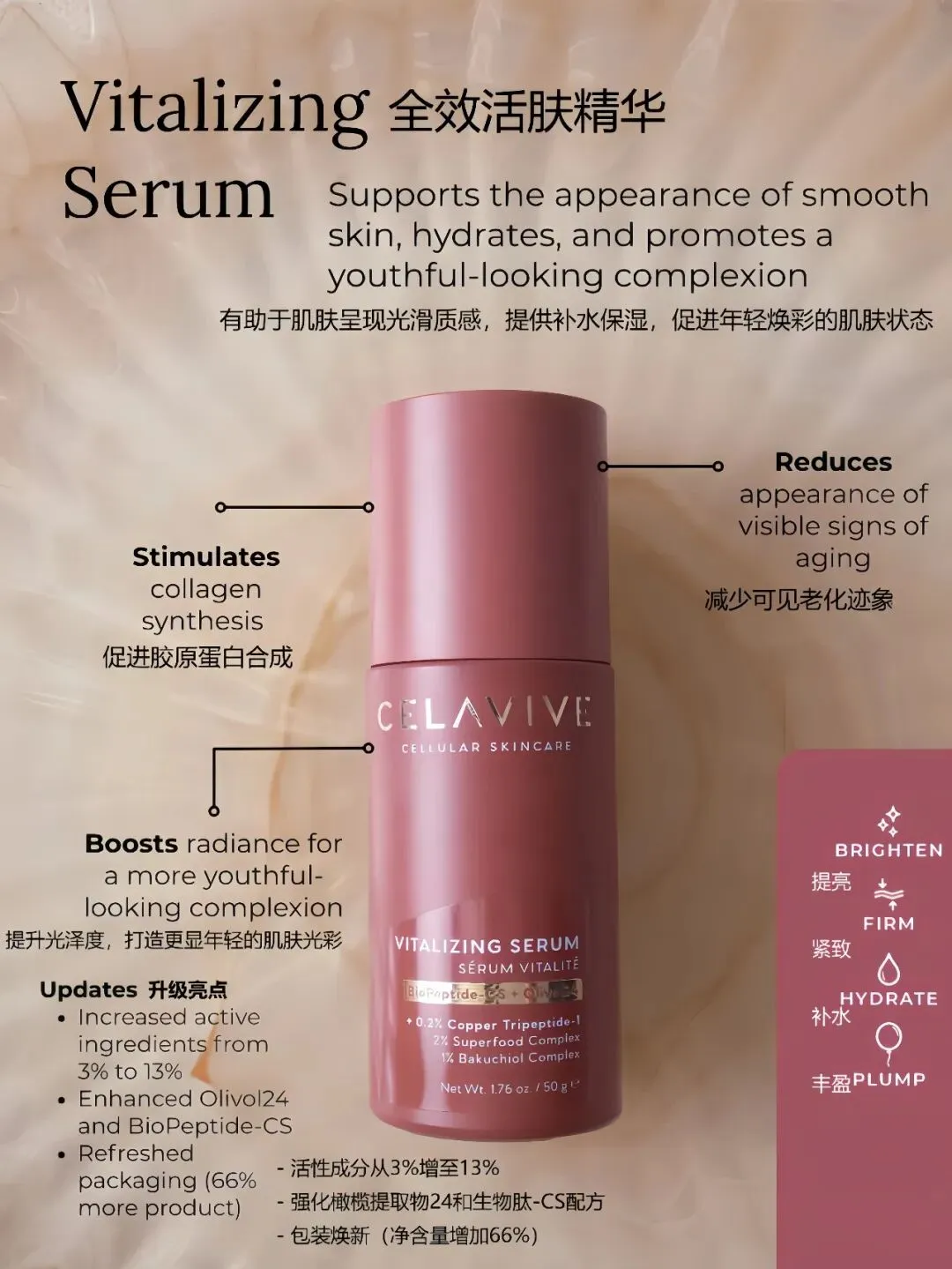 【设计理念】普通护肤品是“缺什么补什么”的被动补充,而CELAVIVE通过BioPeptide-CS实现细胞沟通——用信号肽向皮肤细胞发送指令:“该生产胶原蛋白了、该修护屏障了”。这是从根源上激活皮肤自身能力,而非表面功夫。