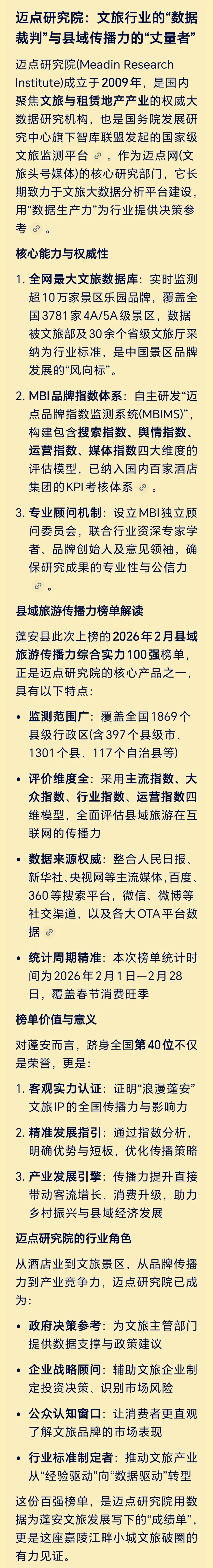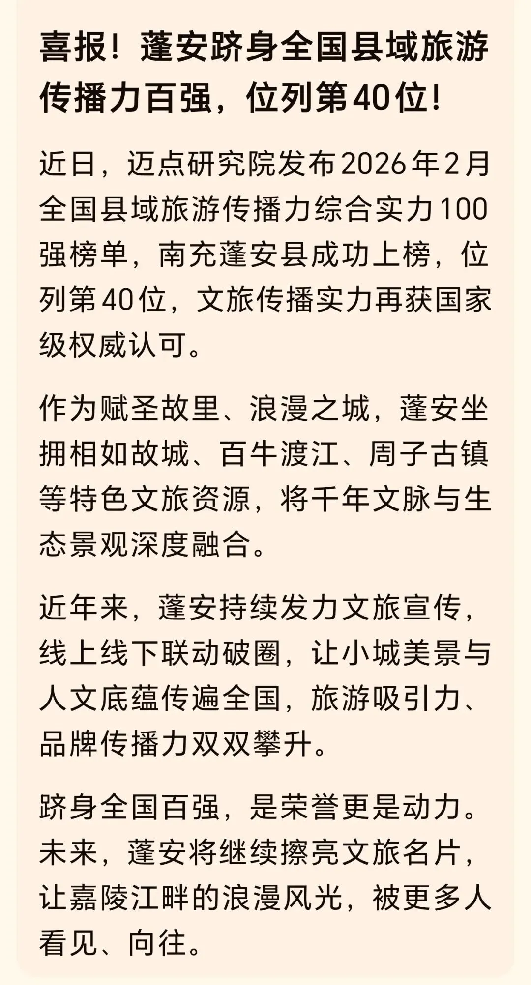 近日,迈点研究院发布2026年2月全国县域旅游传播力综合实力100强榜单,南充蓬安县成功入选,位列第40位。这份来自权威机构的认可,不仅是对蓬安文旅品牌声量的肯定,更是这座嘉陵江畔小城,以文塑旅、以传兴旅的生动答卷。