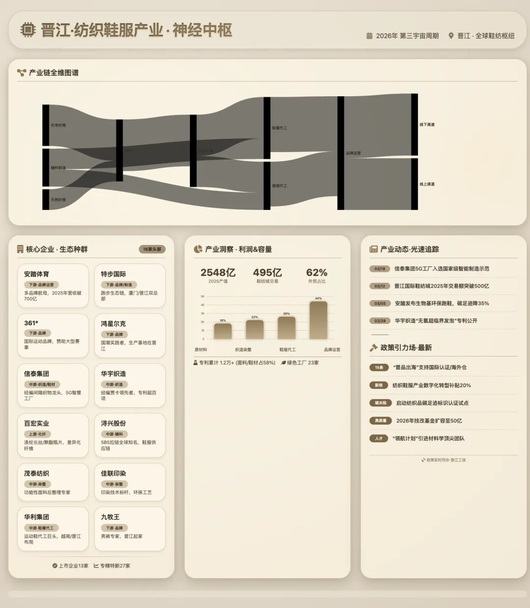 晋江,中国县域经济的“模范生”,正站在一个临界点上。2025年,当全球供应链加速重构,晋江市委市政府提出了一个雄心勃勃的目标:用五年时间,推动鞋服纺织产业产值向万亿规模迈进。这不仅是量的扩张,更是质的飞跃——从单纯的生产制造基地,转型为集研发、生产、展贸、服务于一体的全球供应链中枢。本报告将深度解构这一传统劳动密集型产业,在晋江这片热土上如何通过“科技+时尚”的双轮驱动,突破增长的极限。
