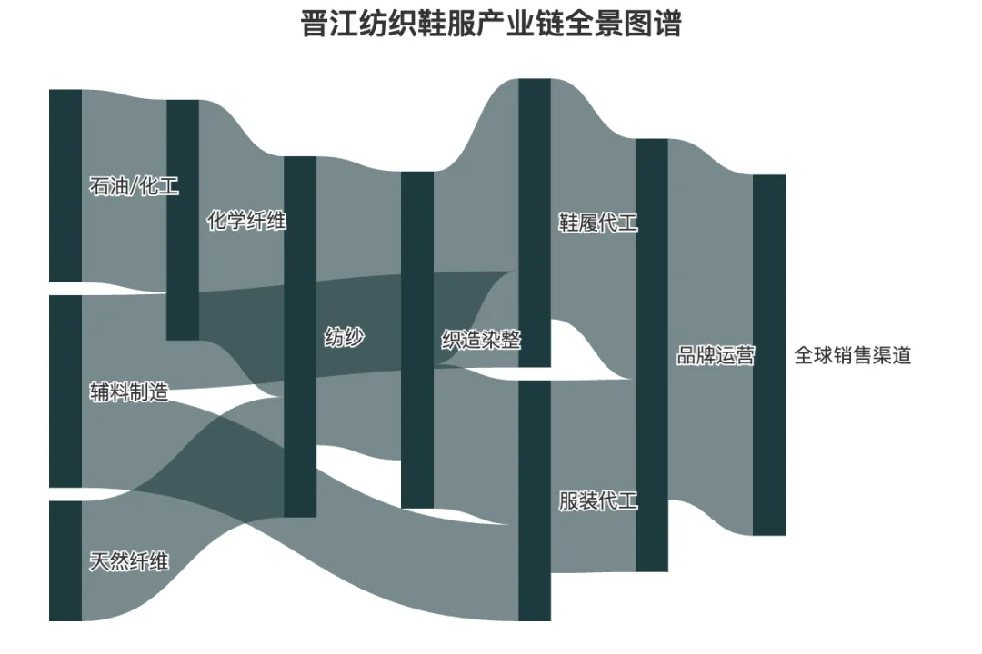 依据国家标准并结合晋江本地产业特征,我们对纺织鞋服产业链进行上、中、下游的拆解。晋江的独特之处在于,其拥有近乎全球最完整的产业链——在半径50公里内,你能找到从化工原料到品牌销售的几乎所有环节。