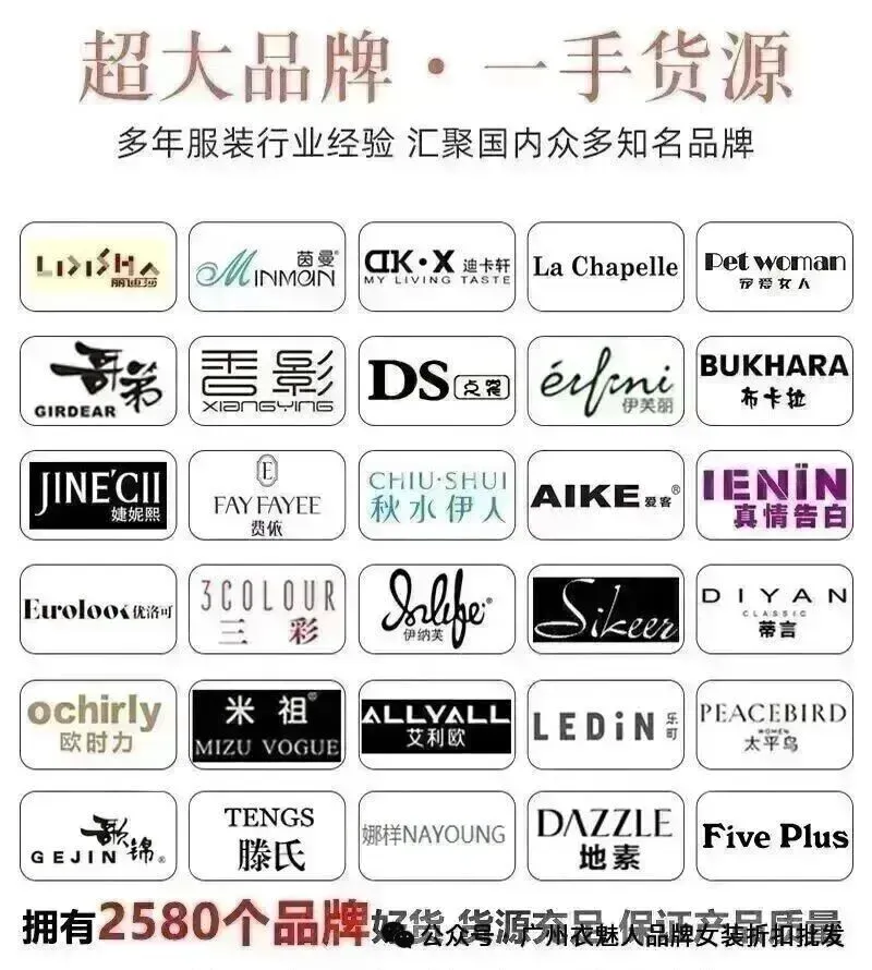 常驻品牌公司旗下常驻品牌,有国风元素,晒谷场,遇见天,见花开,幽篁楮墨吉丘古儿,璞墨,箴言,夏姿绮,忆花寻,花之晨 伦诗,朵拉薇拉,芭依璐,世纪蓝天,UNCODED,Tryme,ANOTHER ONE,UHOT,马可未,维伊,银钻,孔雀夫人 谜柯,梦莎奴,JC,周仕依林,琢盈,兰梦萱,注释,宝莱国际,第五朵,素莹,万古汇,蜂后国际,蒂缇,阿缇娜,爱奴娇,昆诗兰,唯弋,珞炫,黛玫恩,认同,新丝,韩氏伊人,我爱巧克力,CDG小红心,玛塞莉,痕迹 风行凯琦,蔻丽,艾沸,XINGAI,认同,名妹,言梭,吉丘古儿,飞度,秋熠,谷度,唤觉,紫布语,伊华欧秀,KATSURINA,MasiliEr,三彩等一线专柜大牌 涵盖众多风格,年龄段数百个知名品牌,品牌款式丰富,千平展厅,每日上新 专业售后,无忧开店。