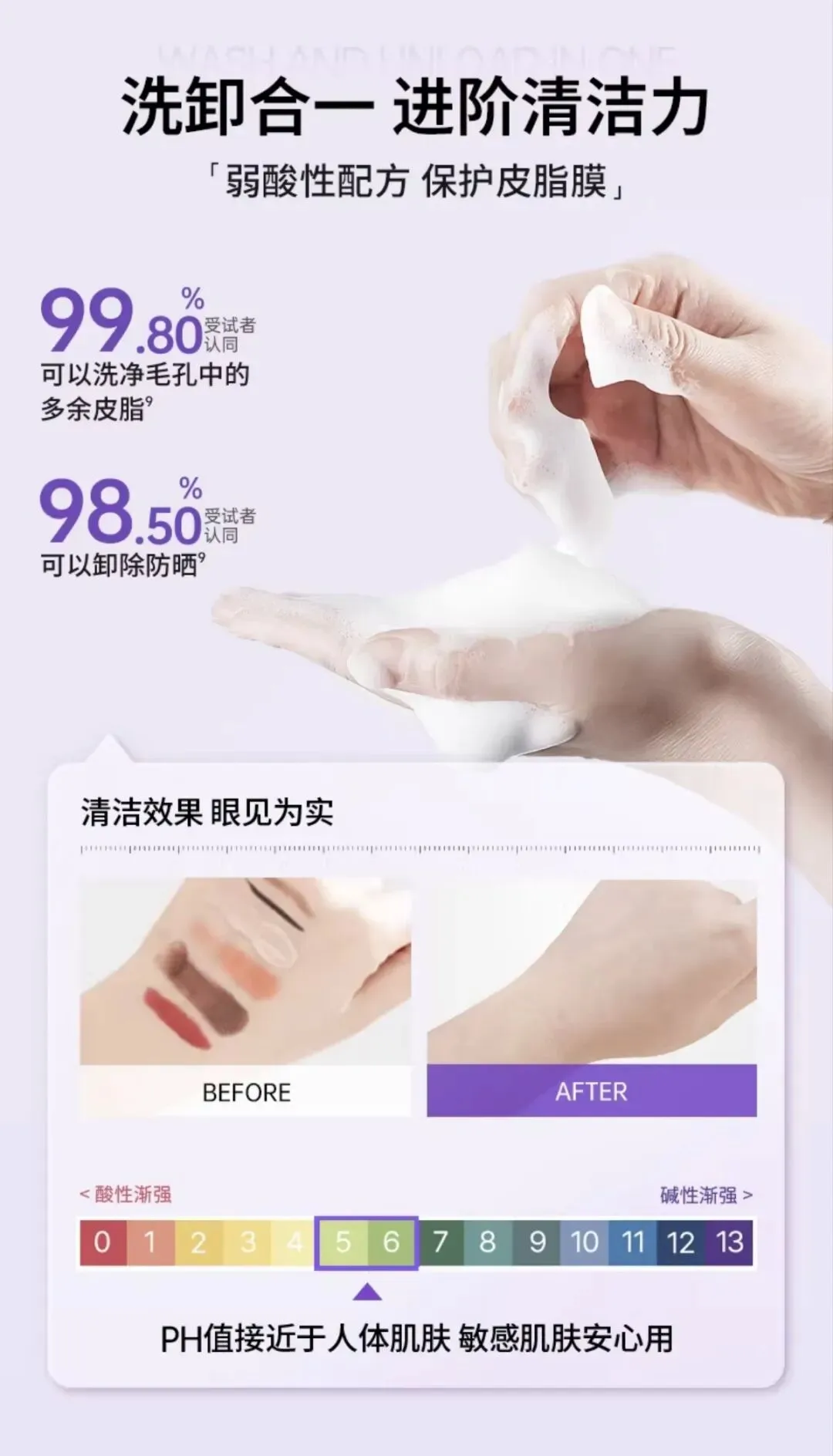 ➋针对干皮/沙漠皮:洗脸后皮肤即时水润度提升35%,即使在北方干燥的秋冬季节,洁面后4小时不涂抹护肤品,皮肤含水量依然能稳定在61%以上,彻底告别紧绷感 。