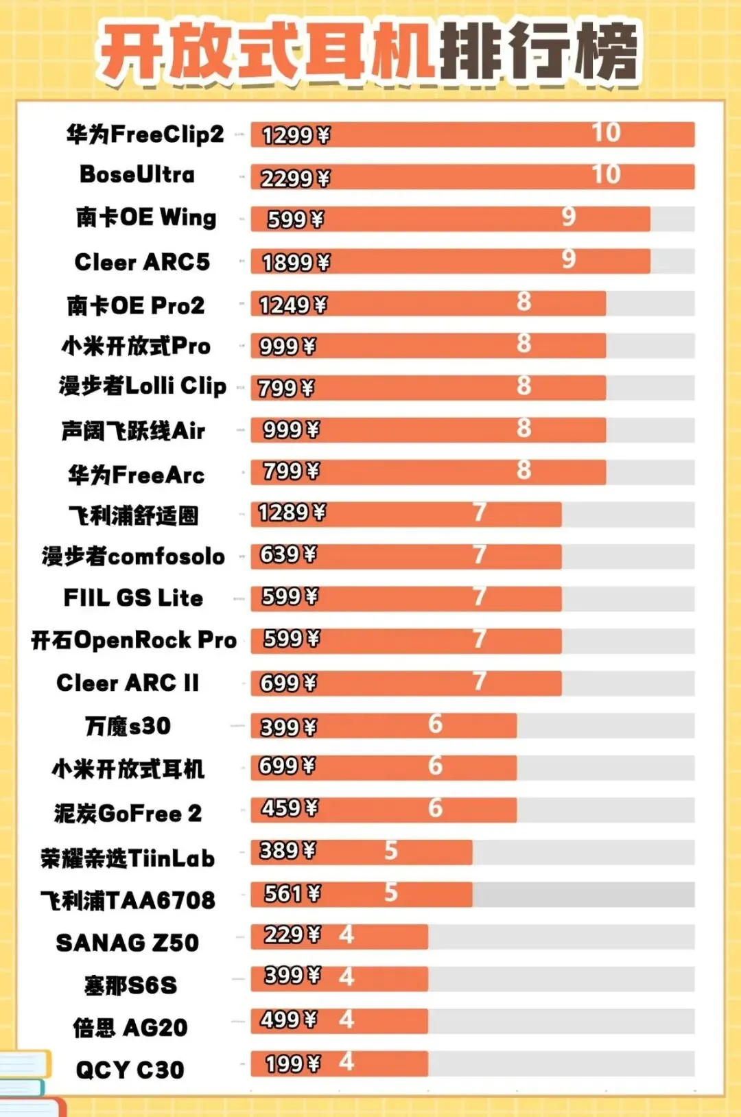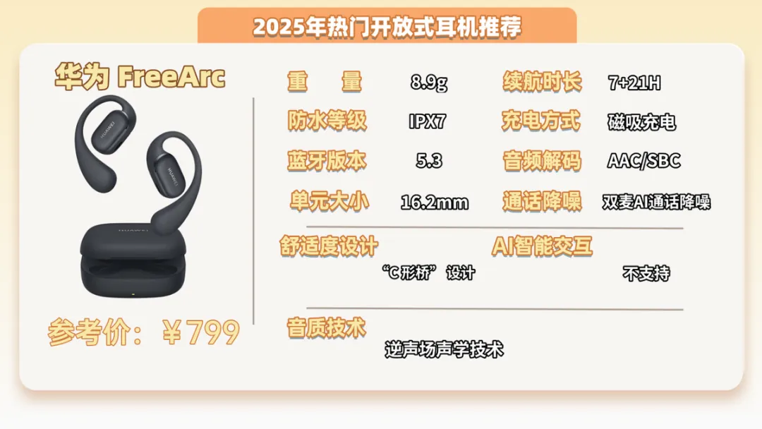 推荐五:华为FreeArc开放式耳机 (799元)推荐指数:⭐⭐⭐⭐机型亮点:人声表现清晰细腻,中频饱满,整体音质均衡