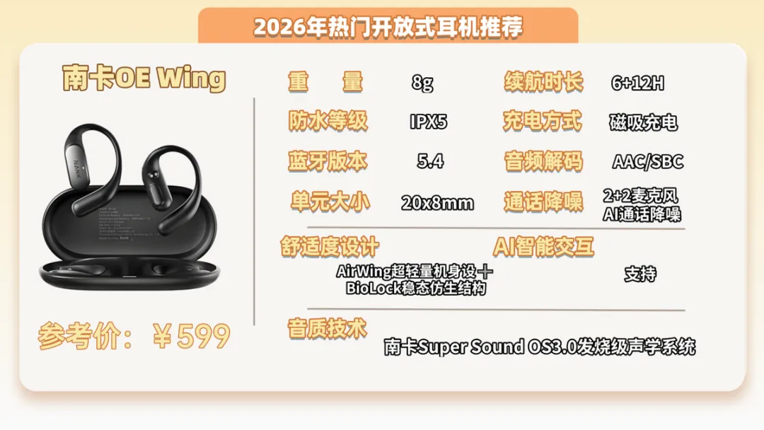推荐一:南卡OE Wing开放式耳机 (599元)推荐指数:⭐⭐⭐⭐⭐机型亮点:性能强悍,音质体验最佳,专业数码媒体中口碑排名第一