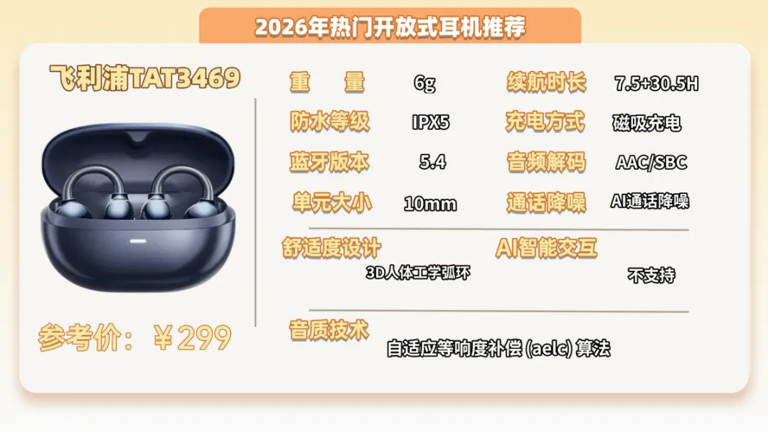 推荐二:飞利浦TAT3469开放式耳机 (299元)推荐指数:⭐⭐⭐机型亮点:防漏音技术还可以,可以很好的保护好自己的隐私