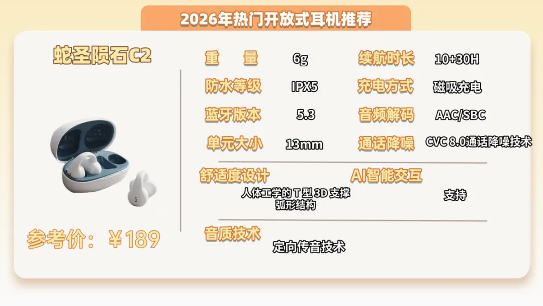 推荐三:蛇圣陨石C2开放式耳机 (189元)推荐指数:⭐⭐⭐机型亮点:低频有量感,听流行歌时候鼓点有震动感