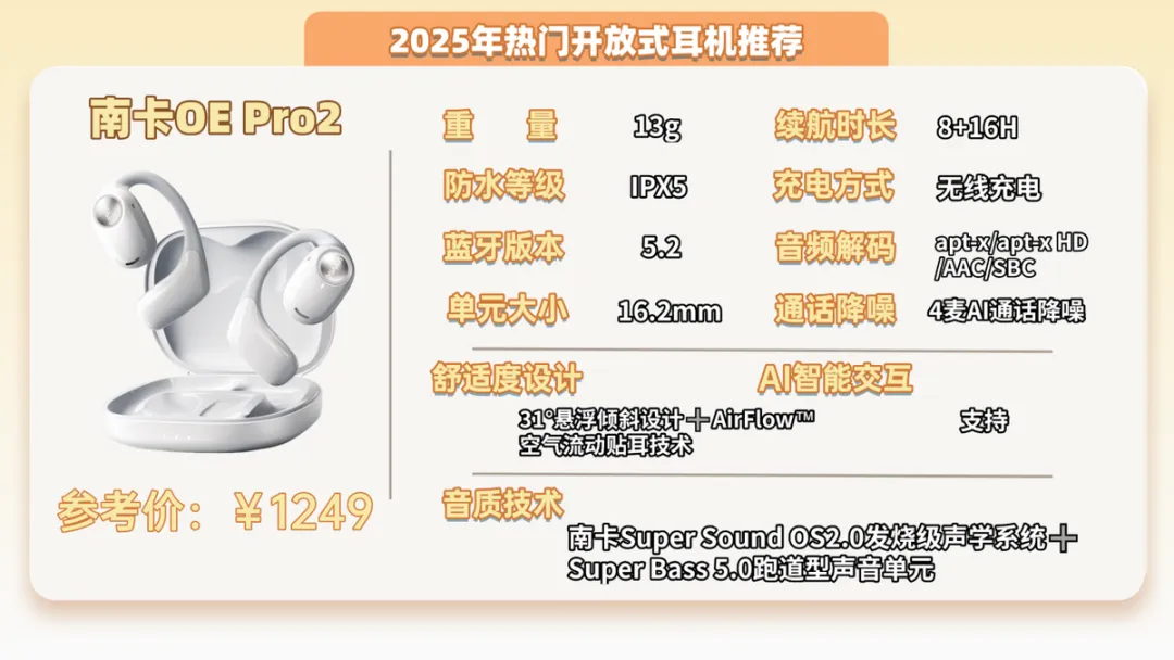 推荐四:南卡OE PRO2开放式耳机 (1249元)推荐指数:⭐⭐⭐⭐⭐机型亮点:被誉为满配旗舰之王,常年霸榜高端口碑销量排行第一!