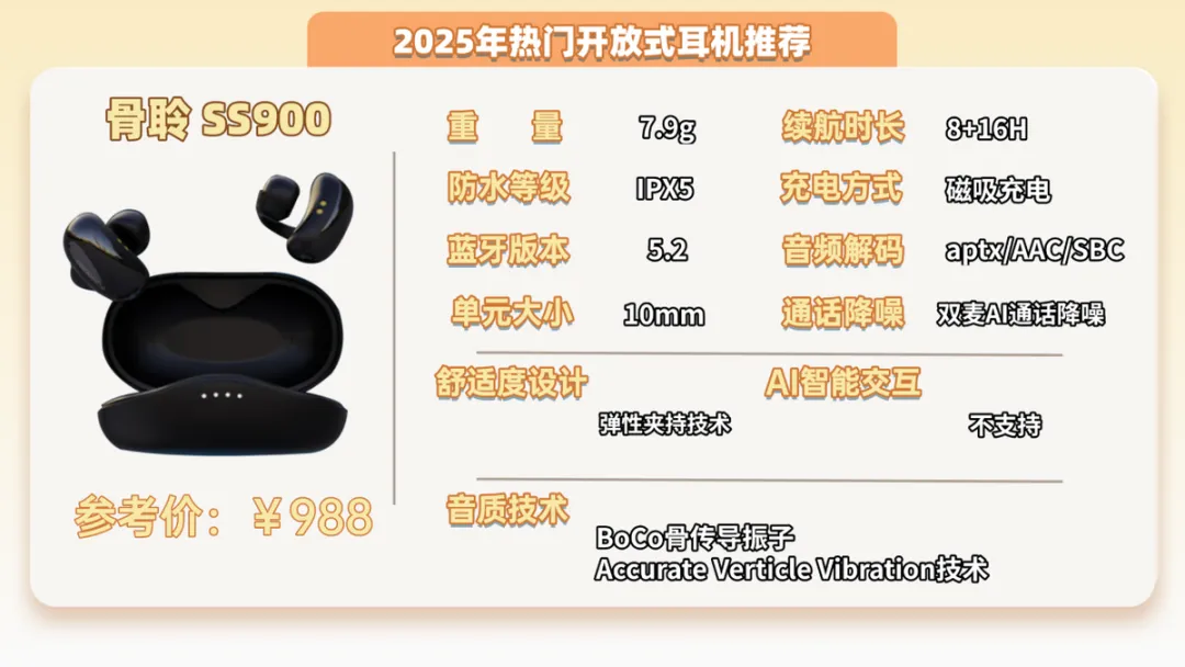 推荐六:骨聆SS900开放式耳机 (988元)推荐指数:⭐⭐⭐机型亮点:中高音优势明显,播放播客时人声清晰
