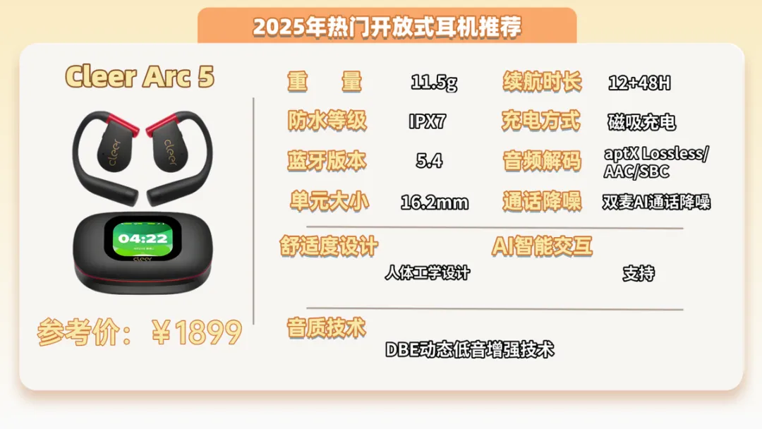 推荐七:Cleer ARC 5开放式耳机 (1899元)推荐指数:⭐⭐⭐⭐机型亮点:续航时间够长,出门不会有充电焦虑